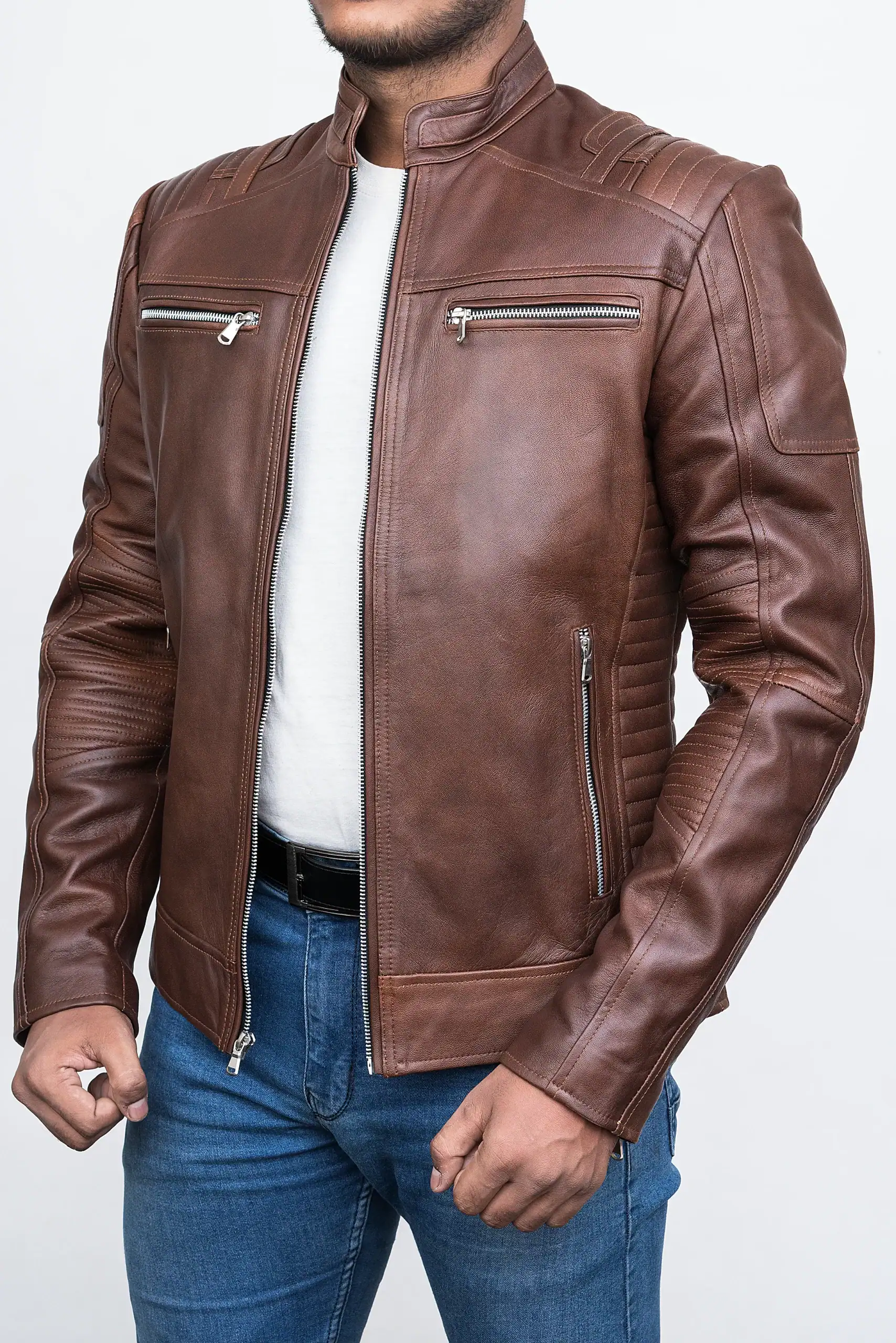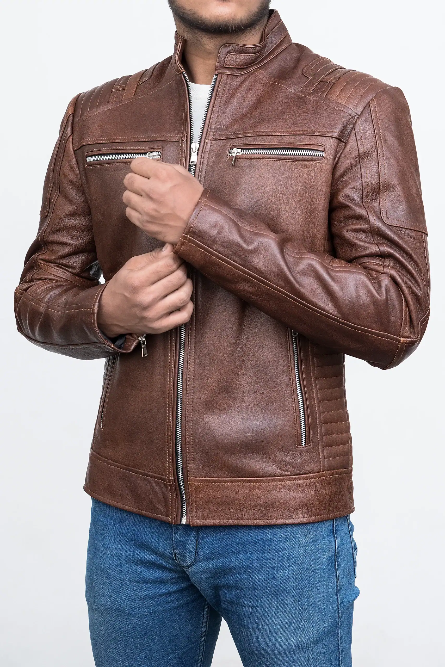 Each detail of this vintage style men’s outerwear speaks volumes about craftsmanship and attention to quality. Designed for those who appreciate authenticity, the rugged vintage leather coat is made to last for years, featuring robust zippers, functional pockets, and a comfortable inner lining that provides both warmth and breathability. The jacket’s classic distressed motorcycle jacket structure pays homage to the golden era of moto fashion — merging durability with raw, masculine energy. It’s not just apparel; it’s a statement. The men’s brown distressed jacket embraces the perfect blend of luxury and toughness, ideal for the man who appreciates a heritage style men’s jacket with personality. Whether paired with jeans and boots or layered over a shirt, this handmade vintage leather jacket adds a bold touch to any outfit. Its old-school moto leather jacket appeal makes it suitable for every generation, from young trendsetters to mature gentlemen seeking refined ruggedness. Every stitch reinforces its reputation as a durable vintage leather coat, tailored to perfection to suit your adventurous lifestyle.