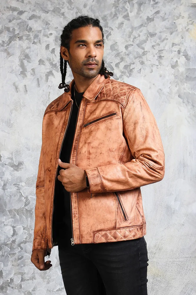 For men who value boldness and sophistication, this premium leather biker jacket is a must-have addition to their wardrobe. The distressed tan leather finish gives it a rugged yet refined appearance that grows better with age. Perfect for riders and fashion-forward individuals alike, this men’s café racer jacket embodies style, confidence, and individuality. Step out with attitude in this designer tan leather jacket — where comfort meets iconic style.