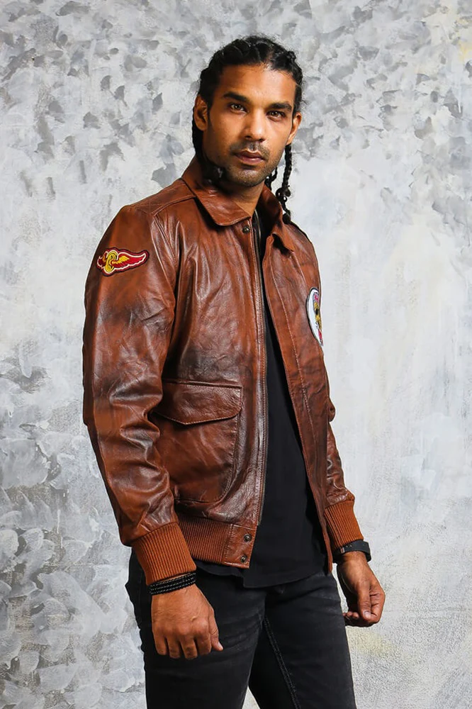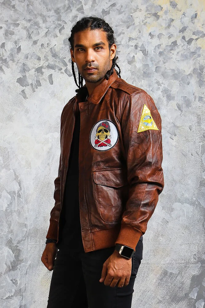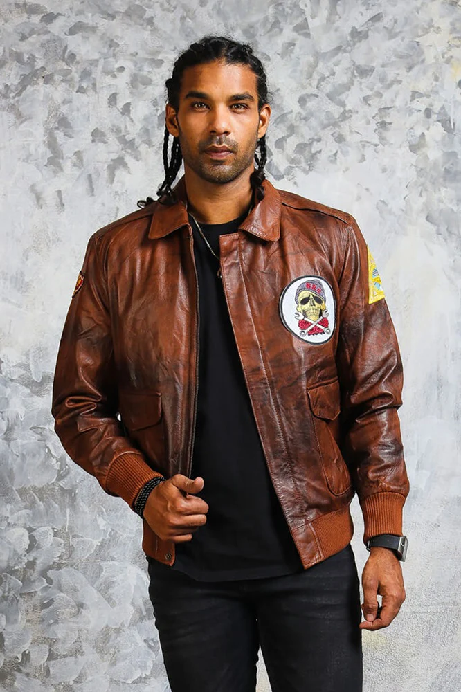 Designed with inspiration from aviator and flight jackets, this men’s leather bomber jacket captures the essence of bold masculinity. The distressed brown bomber jacket look enhances its rugged appeal, while the zip-up front and ribbed cuffs deliver that signature bomber fit. Pair it with jeans or chinos for a confident and fashionable look — a staple piece that defines the men’s brown pilot jacket trend.