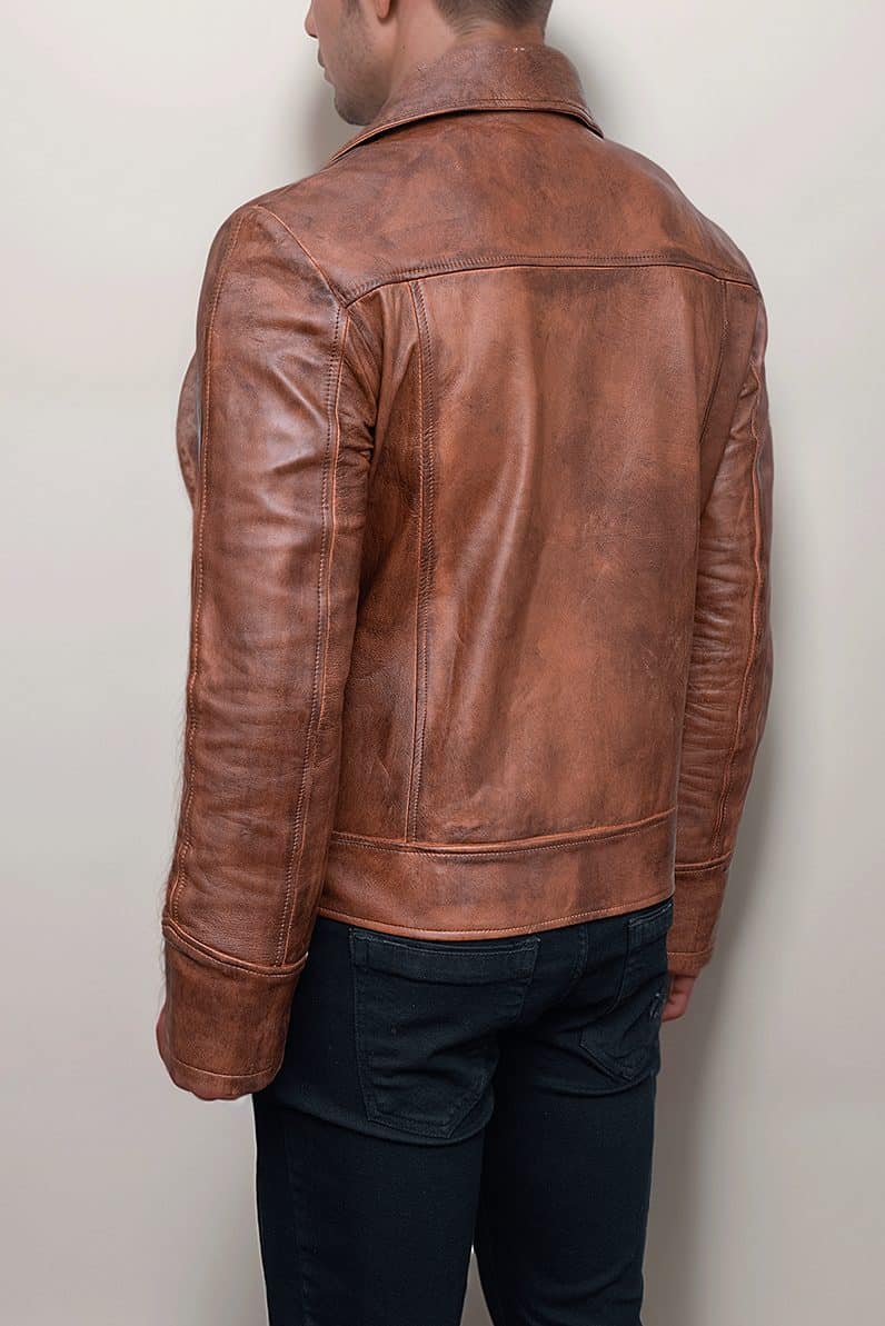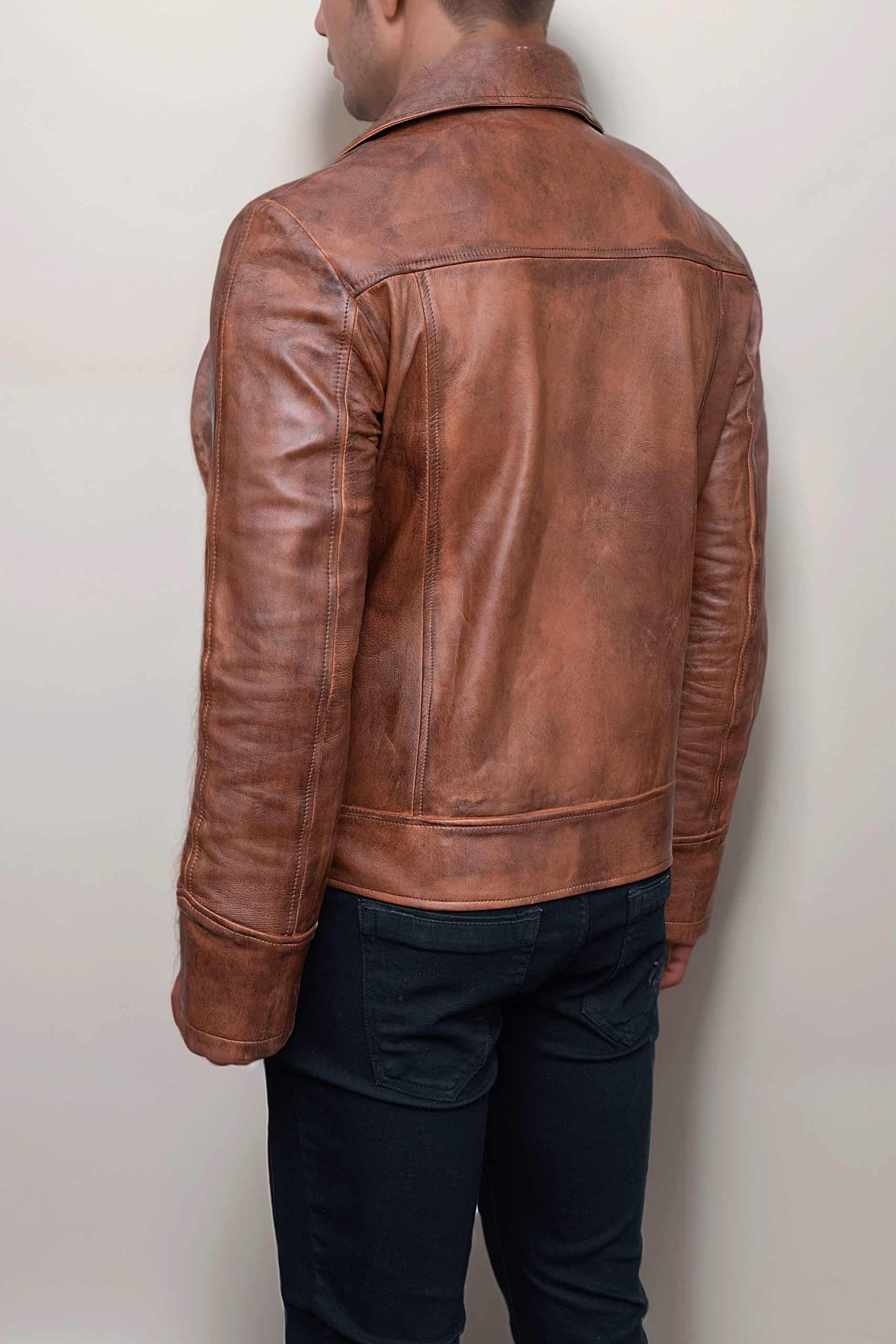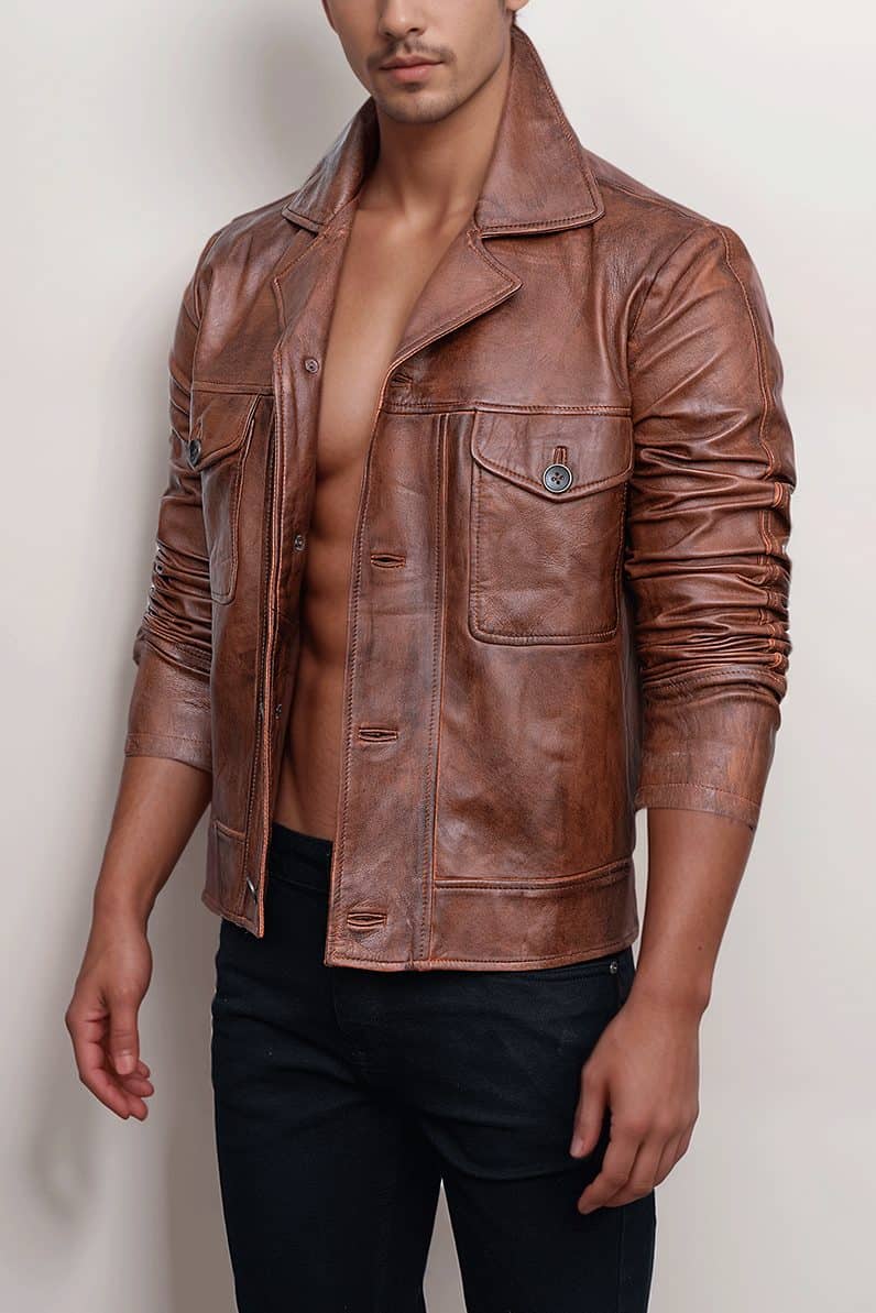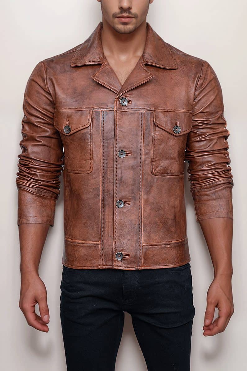 Every detail of this men’s brown trucker jacket has been crafted with precision and purpose. The front button closure, reinforced stitching, and flap chest pockets mirror the traditional trucker jacket design that has stood the test of time. The distressed brown leather jacket finish adds character, giving it a weathered look that evokes memories of the open road and vintage Americana. Inside, the soft lining ensures comfort during chilly days, while the durable outer shell provides protection against the elements. This men’s casual leather jacket pairs effortlessly with denim jeans, boots, or even chinos, making it a go-to choice for everyday wear. The combination of ruggedness and elegance in this rugged trucker style jacket makes it suitable for both outdoor activities and urban lifestyles. The craftsmanship reflects a commitment to quality and authenticity, qualities that define the vintage biker leather jacket trend. Whether you wear it to a night out, a concert, or a road trip, this men’s western trucker jacket becomes more than just an outfit—it becomes part of your personal story. Its timeless brown leather outerwear appeal ensures it never goes out of style, embodying the perfect mix of durability and sophistication.