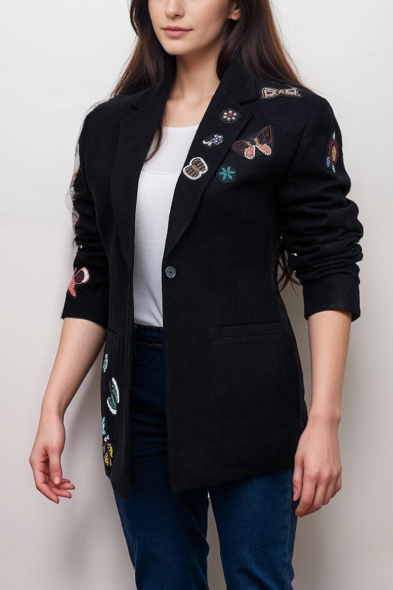 Step into the world of luxury and glamour with this celebrity style blazer, an embodiment of both elegance and empowerment. The Joy Behar black blazer takes inspiration from Joy Behar’s fashion 2025 trend direction—combining the poise of television glamour with everyday wearability. The shimmering sparkle embellished jacket is adorned with butterfly motifs, symbolizing transformation, freedom, and individuality. Each butterfly is embroidered with intricate precision, representing attention to detail and an appreciation for artistic beauty. Whether you are attending an evening soirée or a formal event, this trendy black formal blazer ensures you stand out with effortless charm. The luxury women’s blazer brings the sophistication of Hollywood wardrobes directly to your closet, offering a perfect balance of sparkle and subtlety. From its structured shoulders to its flattering fit, every stitch is designed to highlight your silhouette while maintaining comfort. Fashion enthusiasts who admire Joy Behar’s wardrobe style will instantly recognize the charisma that this blazer brings—a timeless fusion of television icon aesthetics and contemporary fashion appeal.