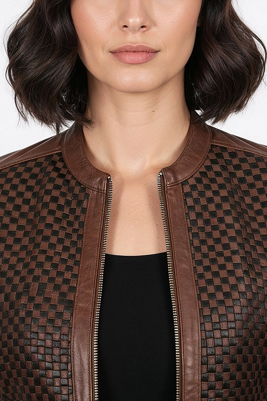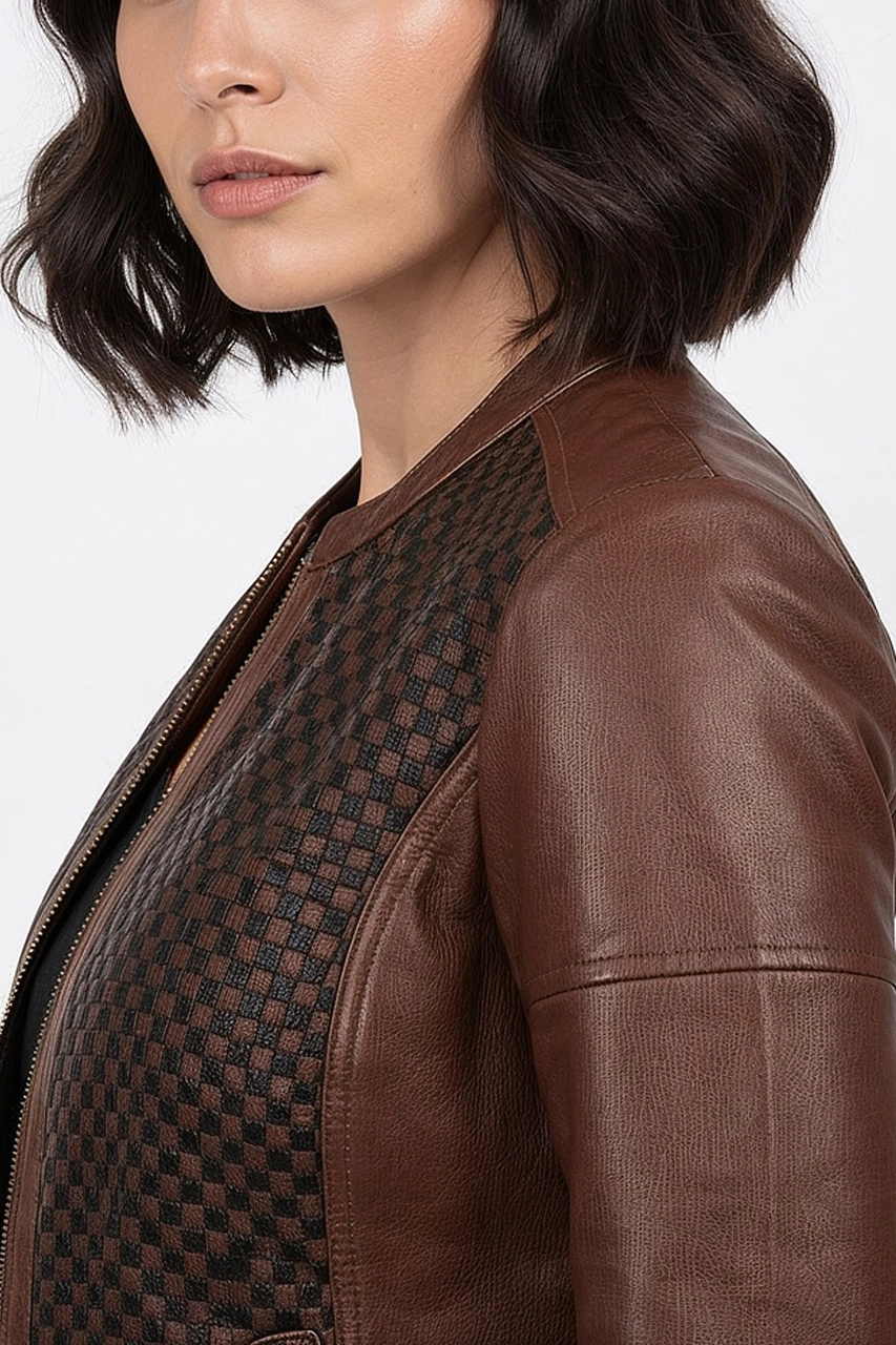 A true fashion essential for modern women, the Women’s Checkerboard Brown Leather Jacket combines functionality with flair. It’s built to last—crafted using premium materials to withstand time while keeping its style relevance intact. The moto checkerboard jacket cut provides a flattering structure, giving you that confident, powerful silhouette that defines today’s leading fashion-forward women. From influencers to stylists, everyone is embracing the vintage checkerboard jacket look for its versatility and charisma. As a high-fashion women’s outerwear piece, it seamlessly complements accessories like boots, belts, and layered jewelry. Each feature—from its tailored fit to the smooth zipper closure—reflects a balance of elegance and edge. This bold, statement-making jacket celebrates individuality while staying rooted in classic craftsmanship. Perfect for those who appreciate artisanal design, luxury texture, and sustainable fashion, this women’s checkerboard leather jacket stands as an embodiment of both confidence and creativity. It’s not just a jacket—it’s your signature style piece, ensuring every outfit becomes unforgettable.