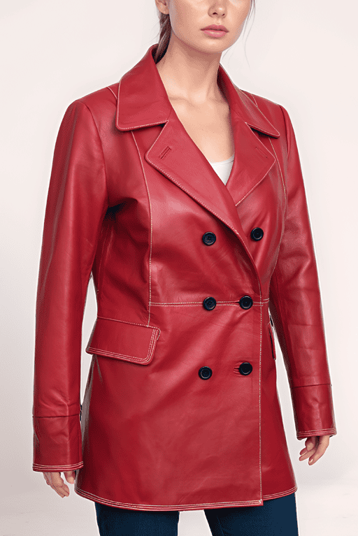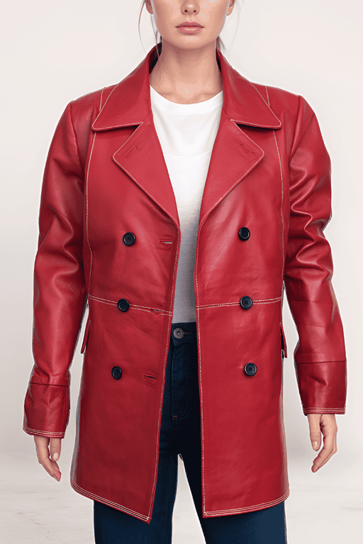 Designed with versatility and premium aesthetics in mind, the Women’s Classic Red Double-Breasted Leather Blazer epitomizes modern femininity. Its soft yet durable texture represents the essence of a formal leather jacket for women, suitable for those who love merging luxury with practicality. The polished silver-toned buttons enhance its bold red shade, creating a dynamic contrast that catches the light with every movement. The elegant red leather coat structure ensures comfort without compromising on elegance, while the smooth inner lining provides an effortless fit. Perfect for women who appreciate premium red leather outfits, it’s ideal for making a statement in professional and social settings alike. The slim-fit red leather blazer design elevates your natural elegance, ensuring you stand out while maintaining sophistication. Whether you’re inspired by global runways or fashion-forward streetwear, this blazer reflects the pinnacle of women’s leather fashion blazers—a blend of empowerment, beauty, and contemporary grace. In a world of fast-changing trends, this piece remains an enduring icon of timeless red leather fashion, empowering you to express your individuality with every wear.