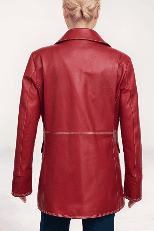 This red statement blazer is more than just an outer layer—it’s an emblem of bold fashion and individuality. With its structured shoulders, crisp lapels, and elegant double-breasted front, it transforms from a women’s office leather blazer to a dazzling piece for night outs or events. The design channels the strength and authority of the traditional red power blazer, while its designer-inspired leather blazer look adds a modern flair. The deep, trendy red blazer 2025 tone embodies energy and passion, setting the perfect tone for any confident appearance. Whether styled over a black pencil skirt for the office or paired with denim for a street style red leather jacket look, it adapts to any fashion mood. The red moto blazer for women influence gives it a subtle edge, while the polished finishing keeps it classy. From boardroom meetings to evening dinners, this blazer becomes your go-to fashion armor, offering versatility that transcends seasons and trends. Its enduring style ensures it remains a timeless red leather fashion statement that always turns heads.
